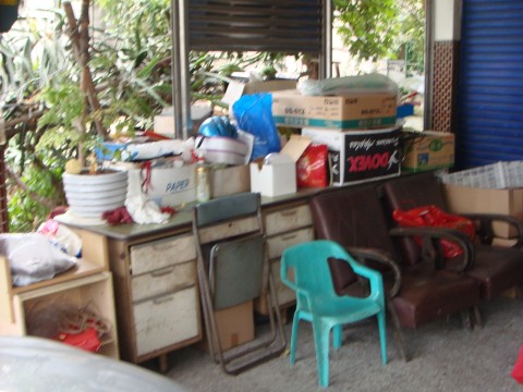 As to the relatives who were still very much alive, they live in what a friend of mine described as "a garage": Just imagine a standard width garage with a TV on one of the long sides, some furniture which looks like it was rescued from the trash on the opposite side, ugly plastic items all over the place and a bunch of calenders on the wall (in lieu of pictures) and you've got a popular Taiwanese living room design. Thinking they couldn't afford anything better, I didn't take any pictures. It wasn't until we took a walk around the neighborhood that I learned that most houses belonged to them and that they were richer than I'll likely ever be. Here's a picture of their outdoor collection of "stuff that might still be good for something":
